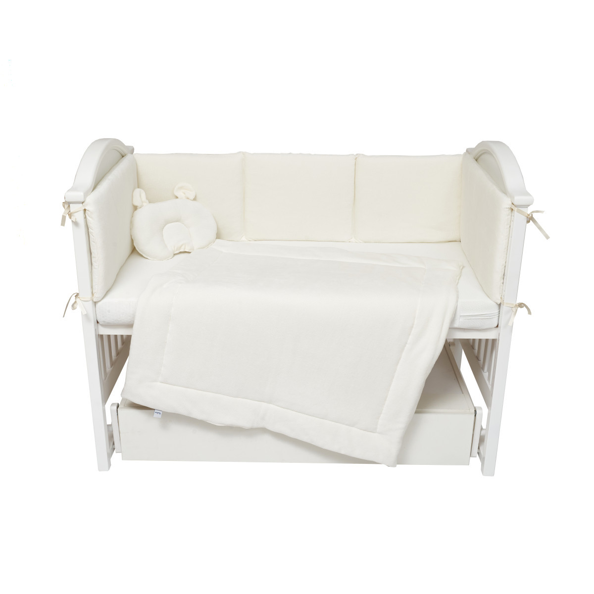 Міцні зав'язки надійно закріплюють бампер на бортиках ліжечка, утримуючи його на місці, навіть якщо дитина активно рухається.